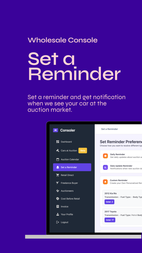 You may spend too much time researching vehicles, comparing prices, and checking history reports. Tools like Wholesale Console can help speed up the process.